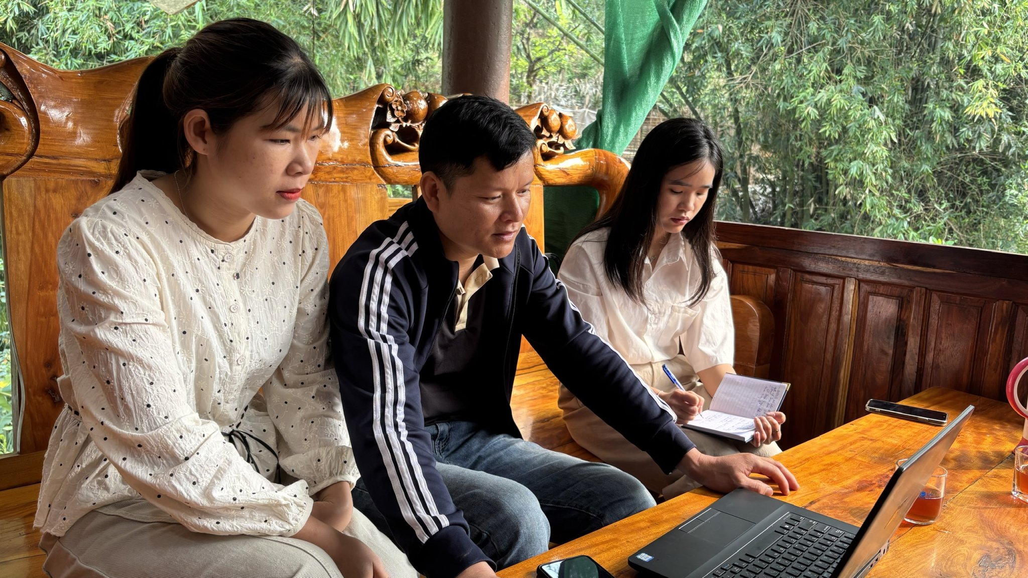 Anh Lường Văn Chùm (ngồi giữa) cùng người thân tham khảo kỹ thuật nuôi trồng thuỷ sản trên internet
