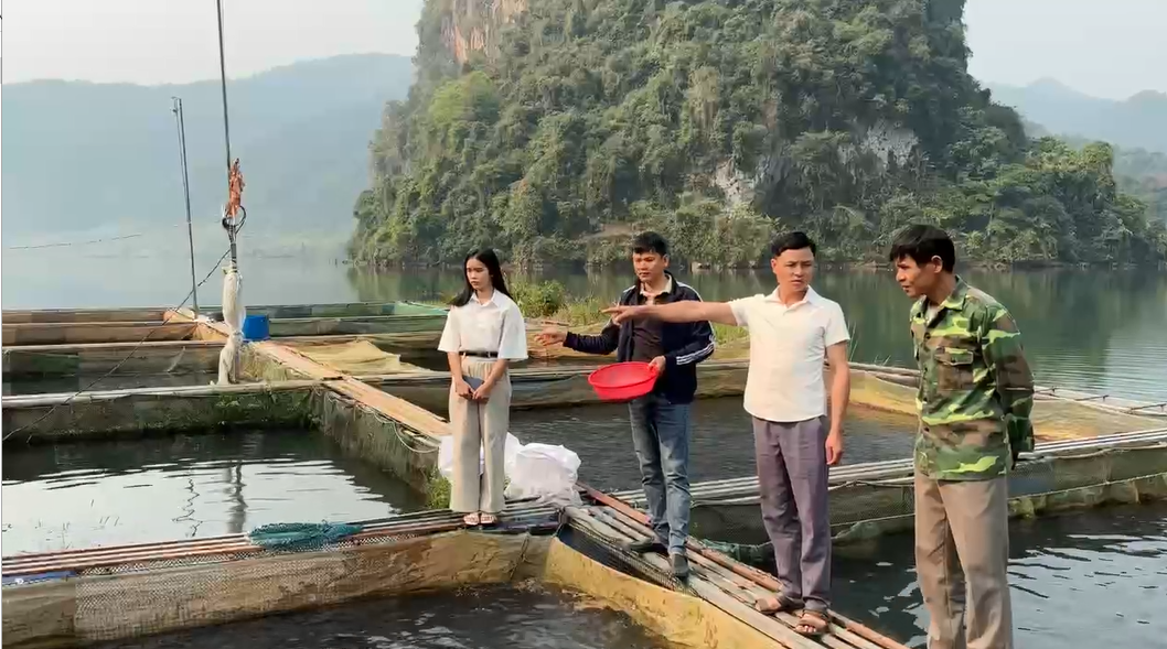 Anh Lường Văn Chùm( người cầm chậu đỏ) giới thiệu mô hình nuôi cá lồng của hợp tác xã thanh niên Ta Gia