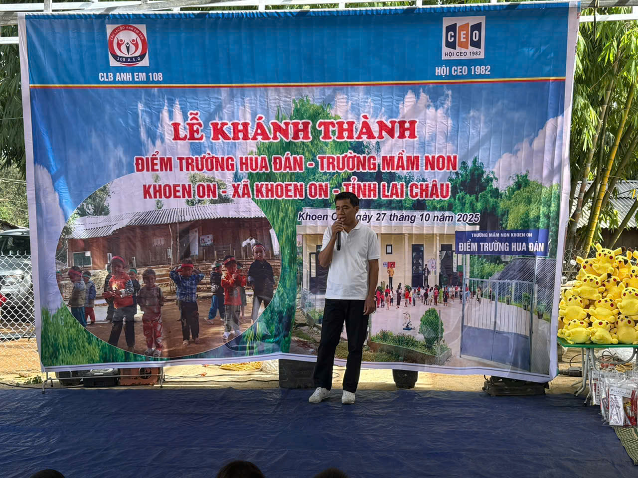 Ngày 27/10/2025, tại điểm trường Hua Đán thuộc Trường Mầm non Khoen On, Câu lạc bộ Anh em 108 và Hội CEO 1982 đã tổ chức Lễ khánh thành và trao tặng công trình tài trợ gồm 02 phòng học khép kín với tổng diện tích 100m², cùng 120m hàng rào thép B40, cột bê tông kiên cố, tổng kinh phí ước tính gần 800 triệu đồng dành cho Trường Mầm non xã Khoen On và các cháu học sinh bản Hua Đán.