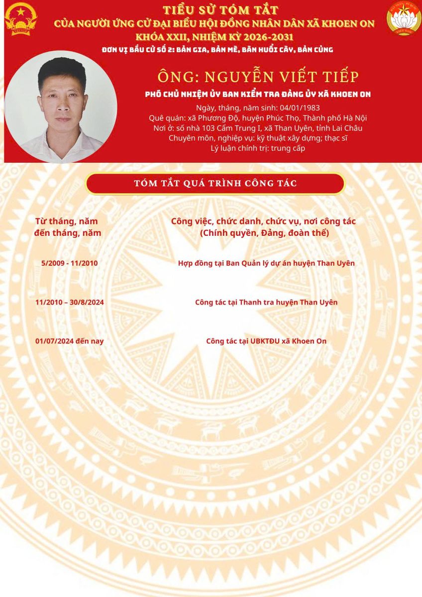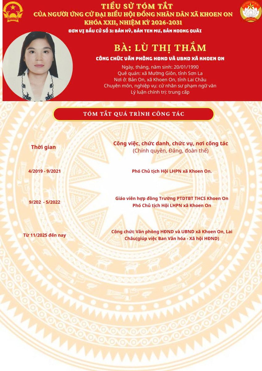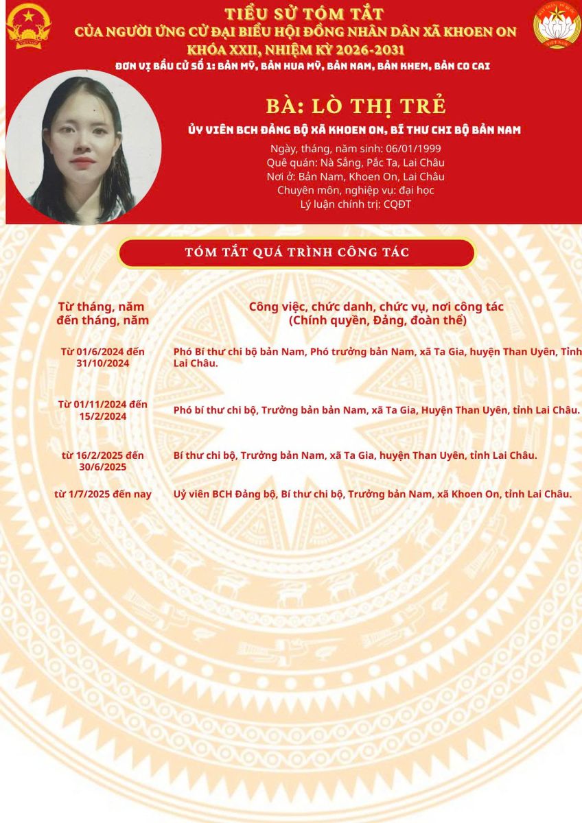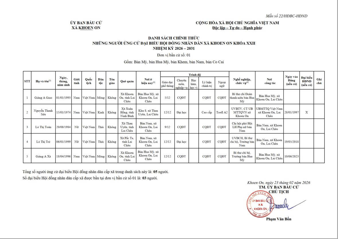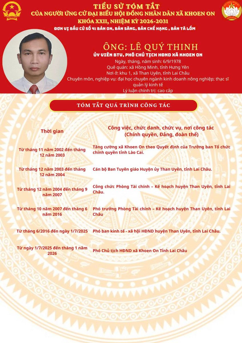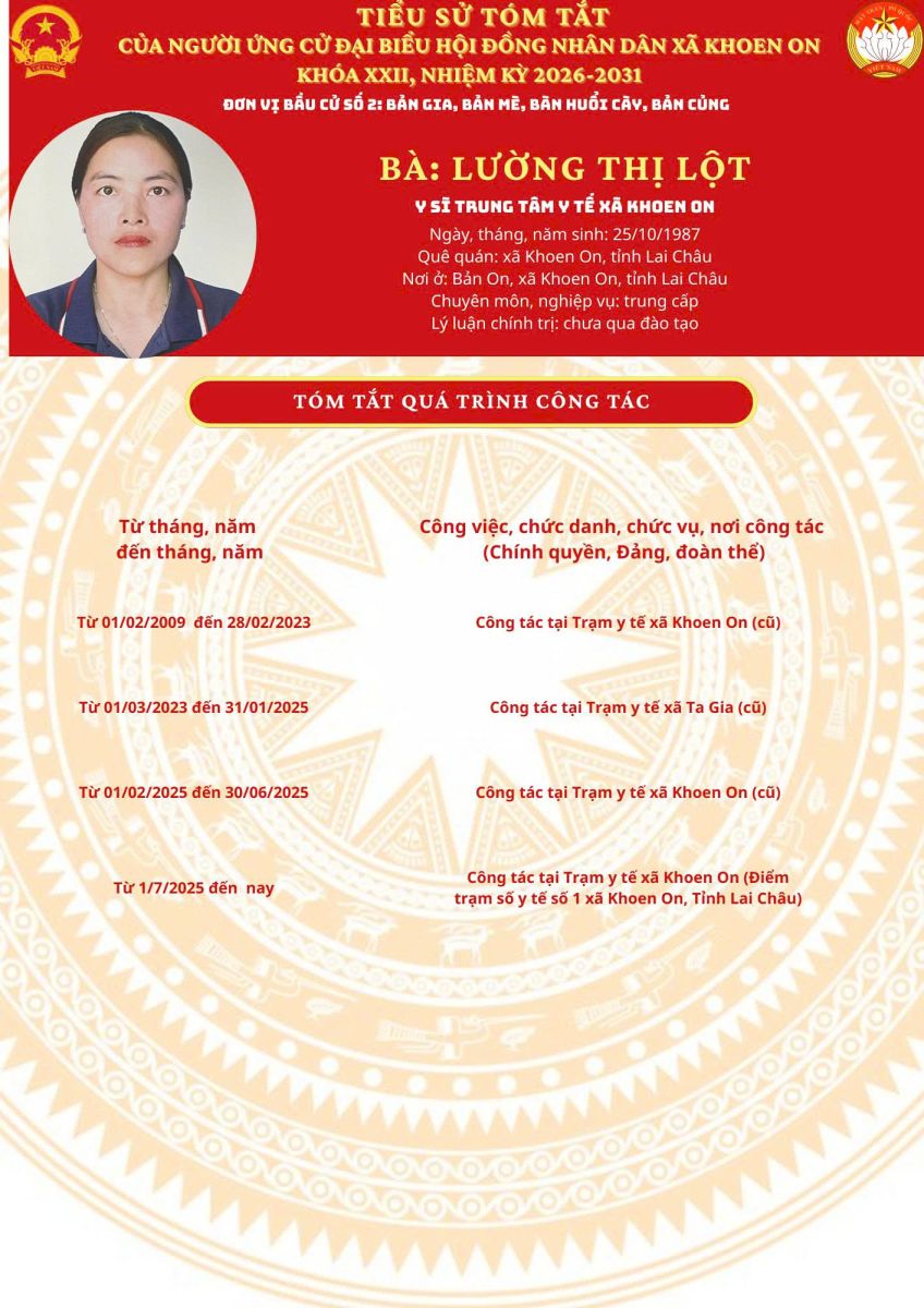 TIỂU SỬ TÓM TẮT NGƯỜI ỨNG CỬ ĐẠI BIỂU HĐND XÃ KHOEN ON KHÓA XXII, NHIỆM KỲ 2026–2031 THEO TỪNG ĐƠN VỊ BẦU CỬ