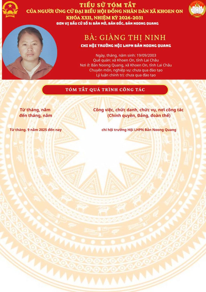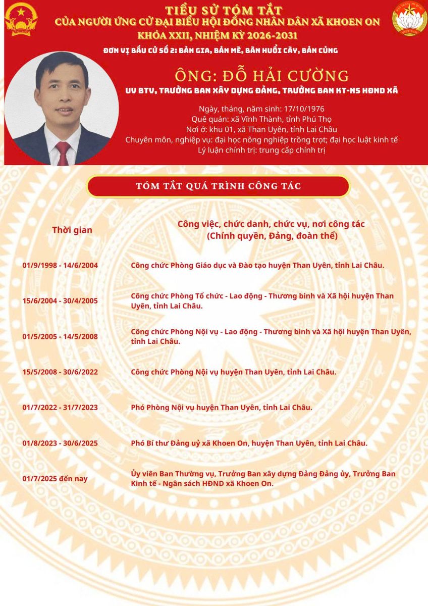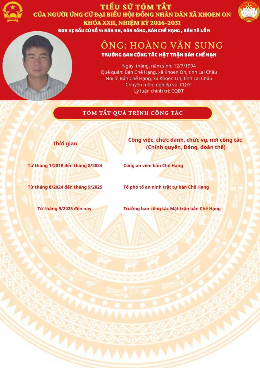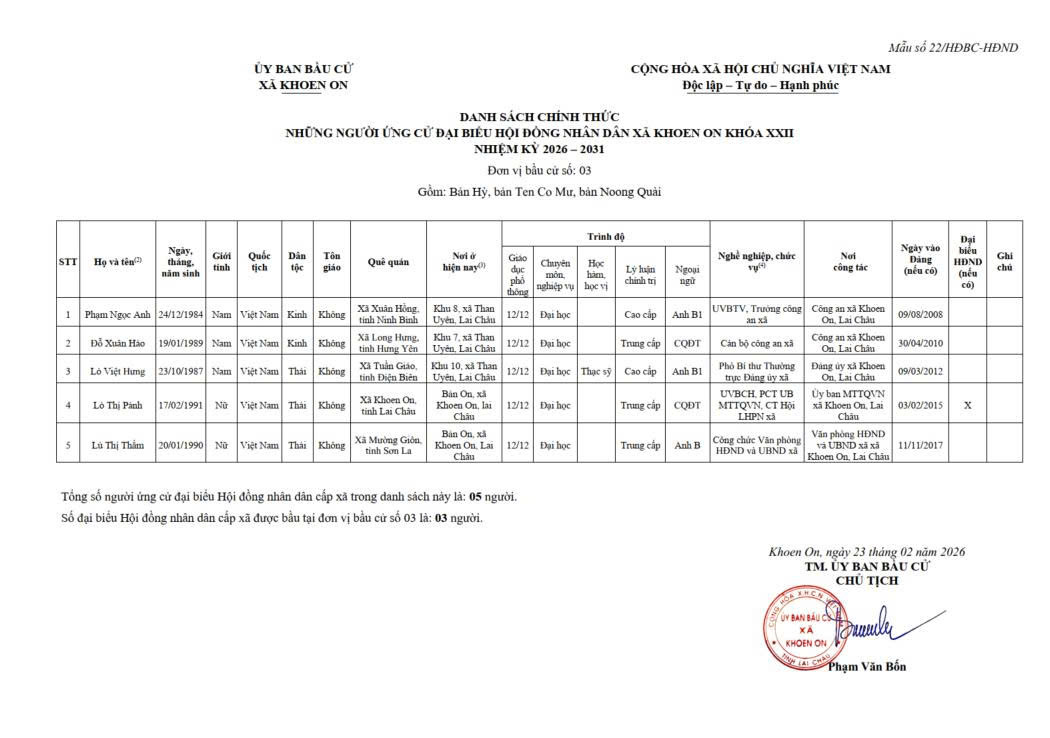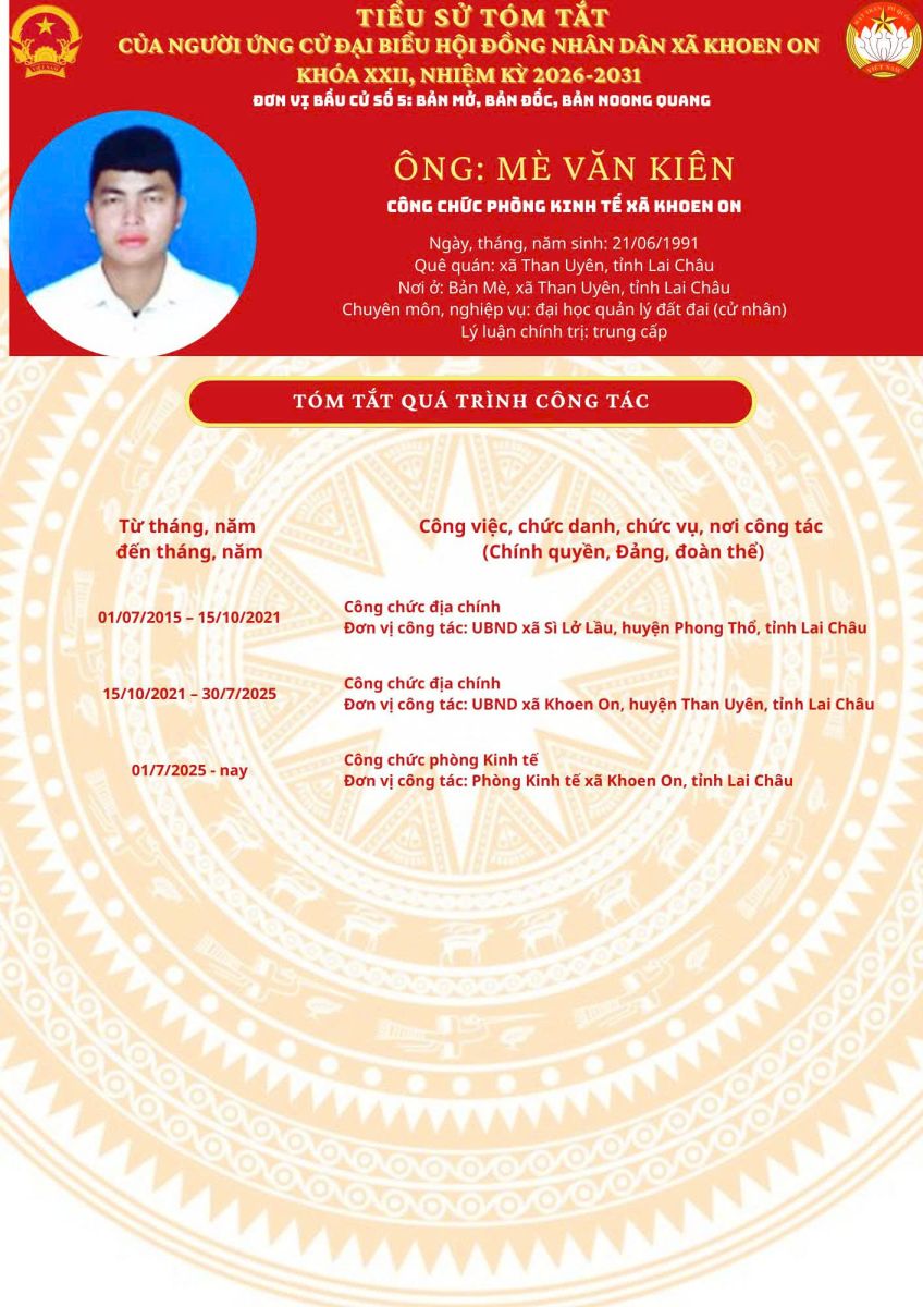 TIỂU SỬ TÓM TẮT NGƯỜI ỨNG CỬ ĐẠI BIỂU HĐND XÃ KHOEN ON KHÓA XXII, NHIỆM KỲ 2026–2031 THEO TỪNG ĐƠN VỊ BẦU CỬ