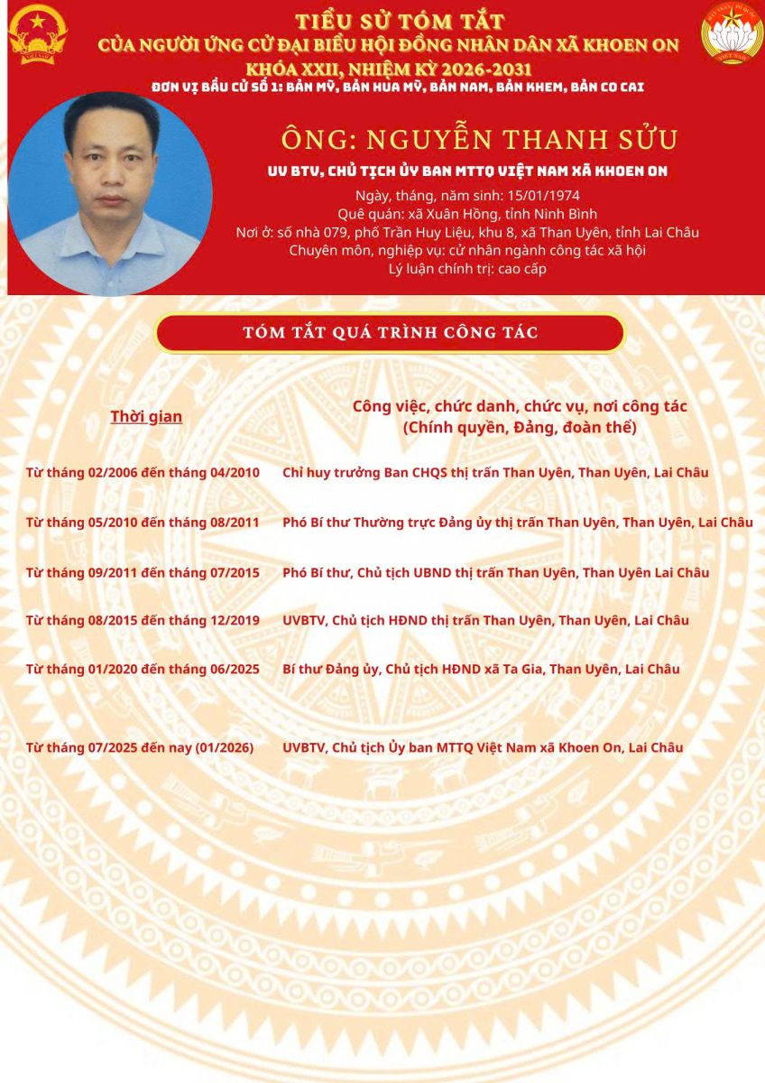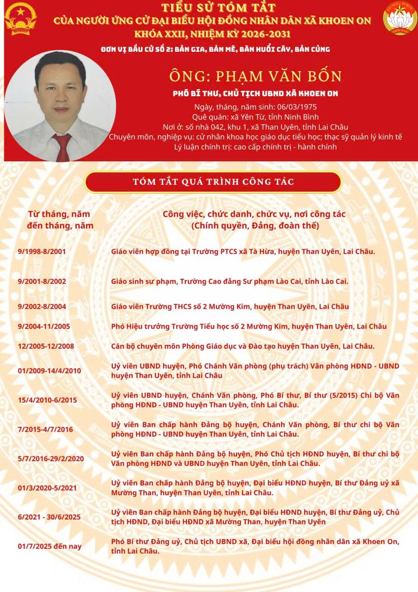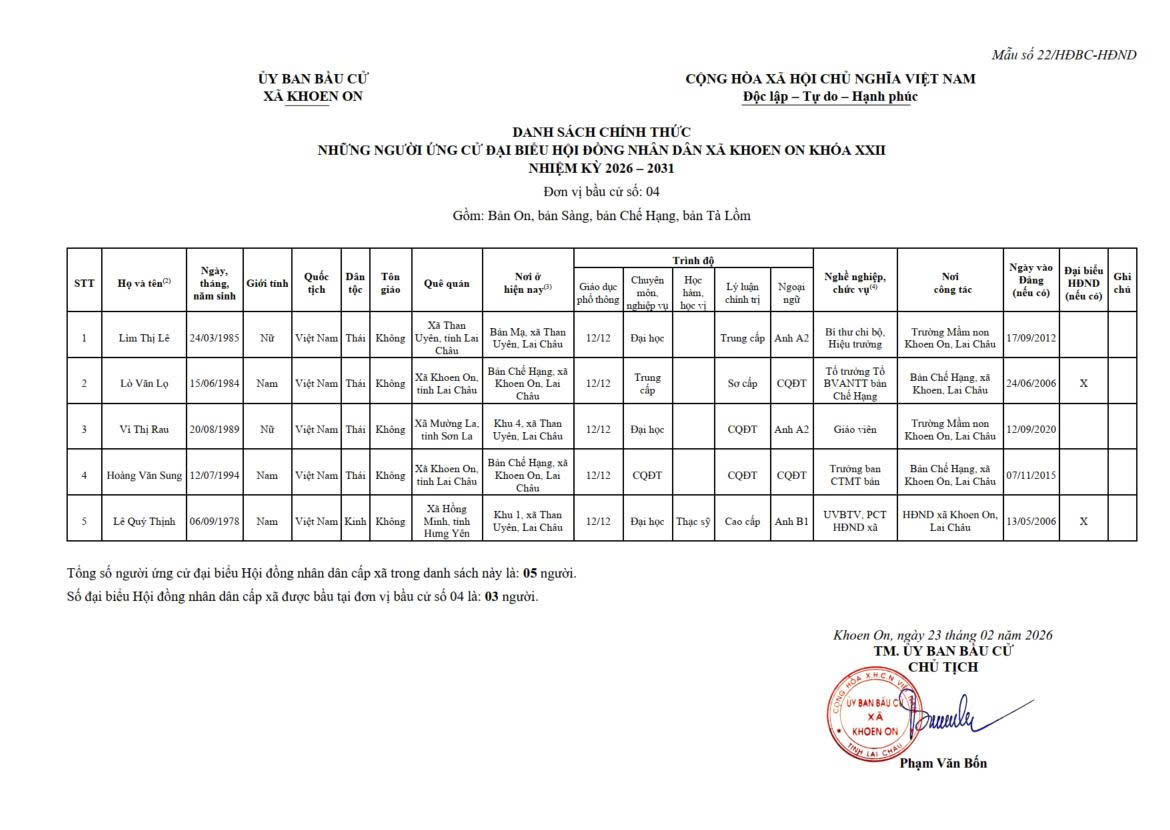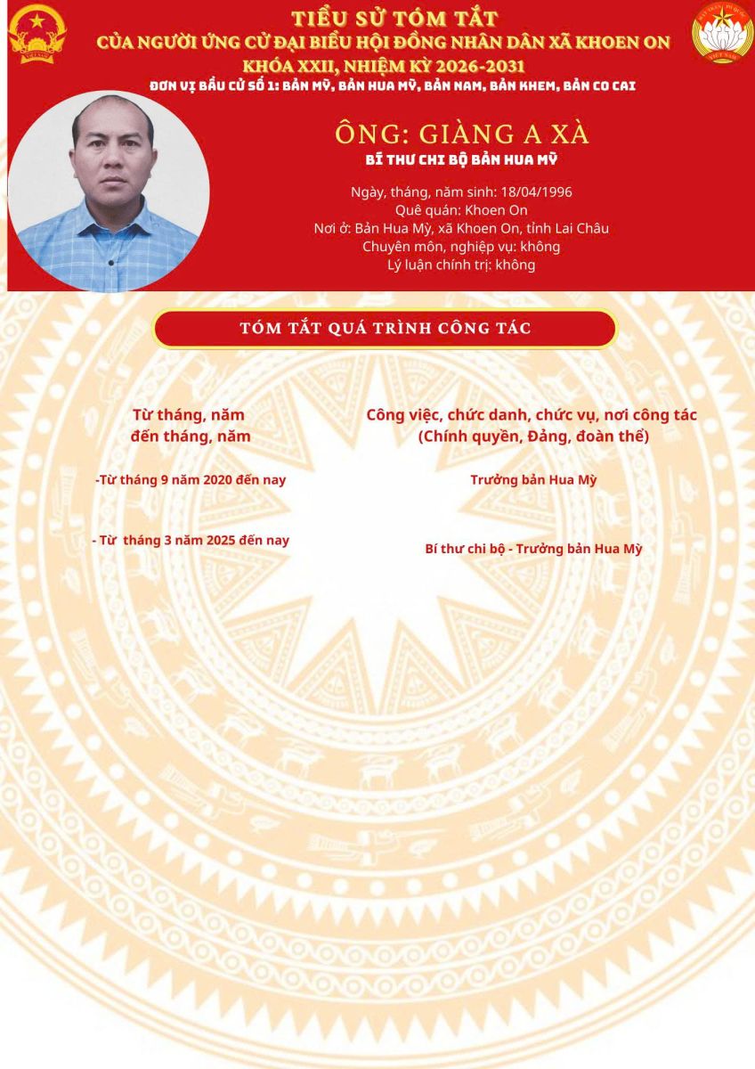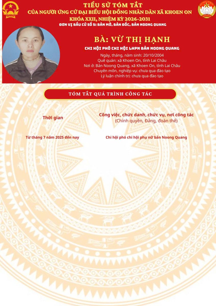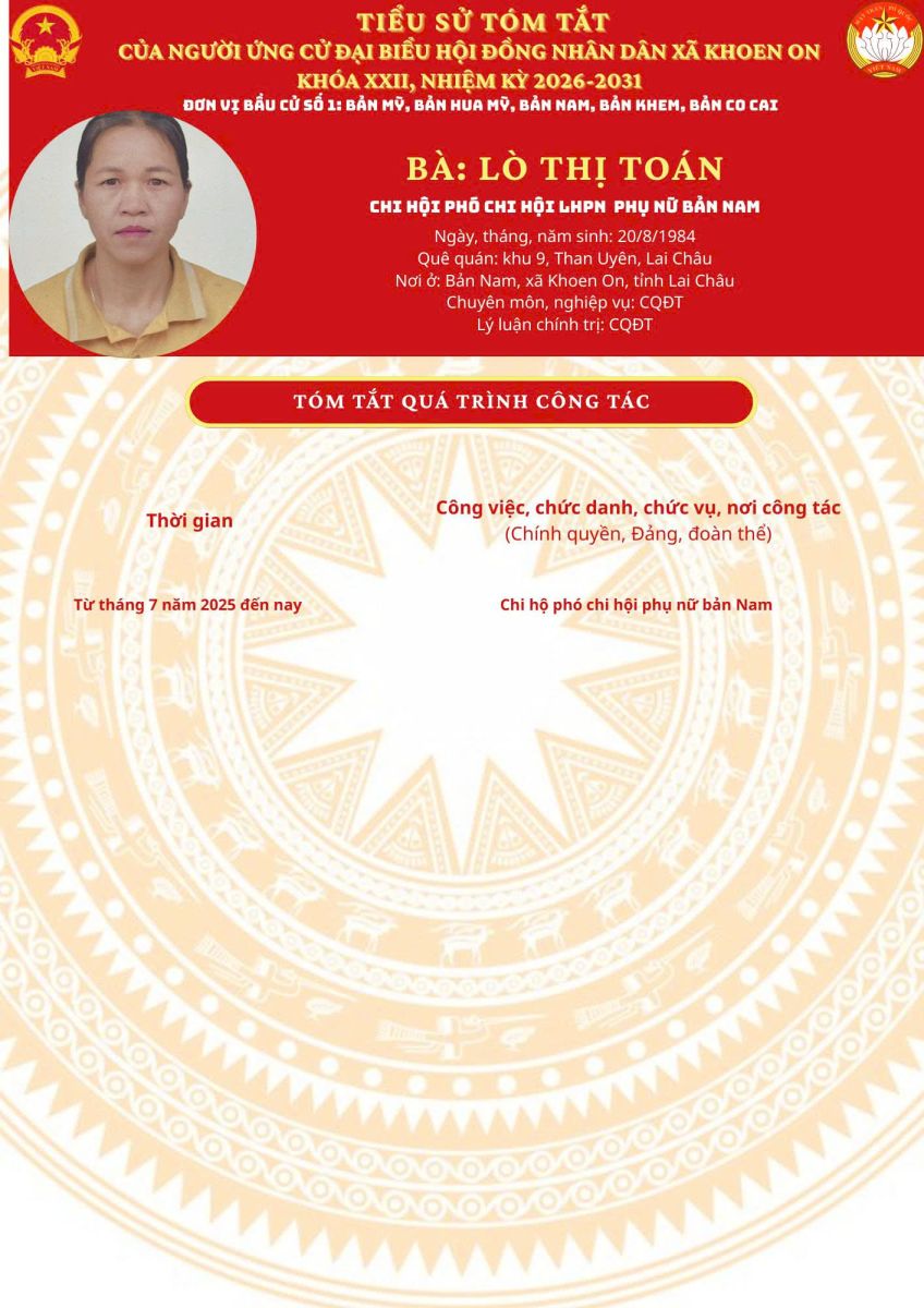 TIỂU SỬ TÓM TẮT NGƯỜI ỨNG CỬ ĐẠI BIỂU HĐND XÃ KHOEN ON KHÓA XXII, NHIỆM KỲ 2026–2031 THEO TỪNG ĐƠN VỊ BẦU CỬ