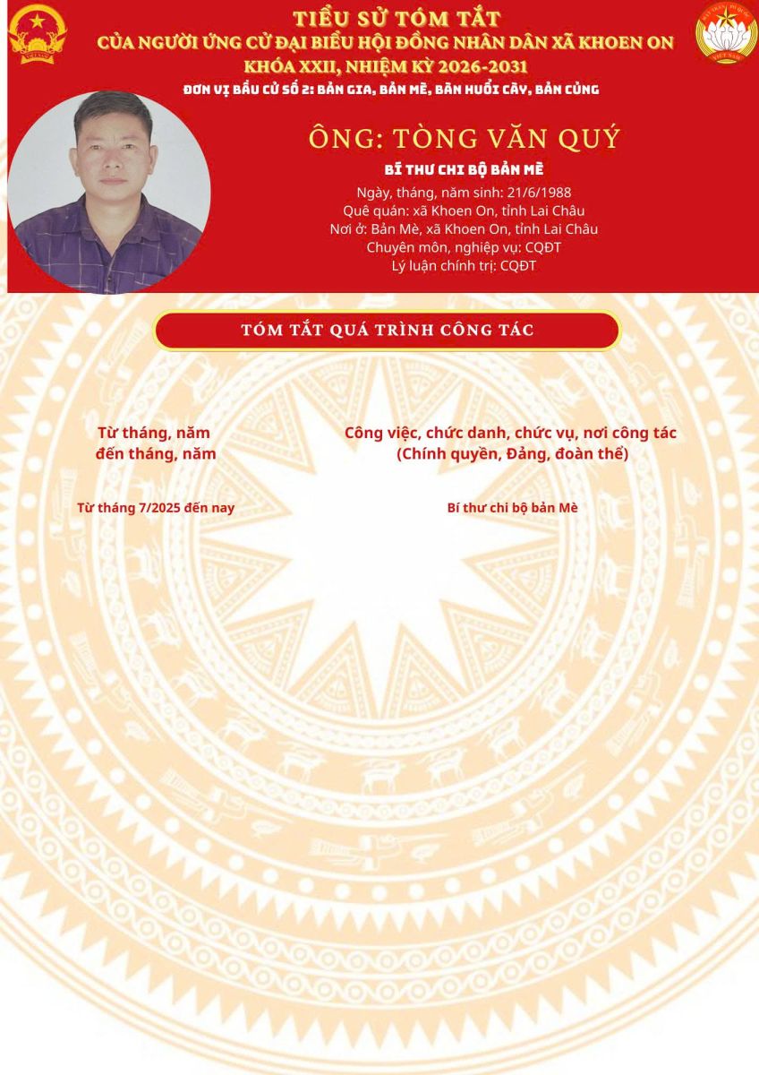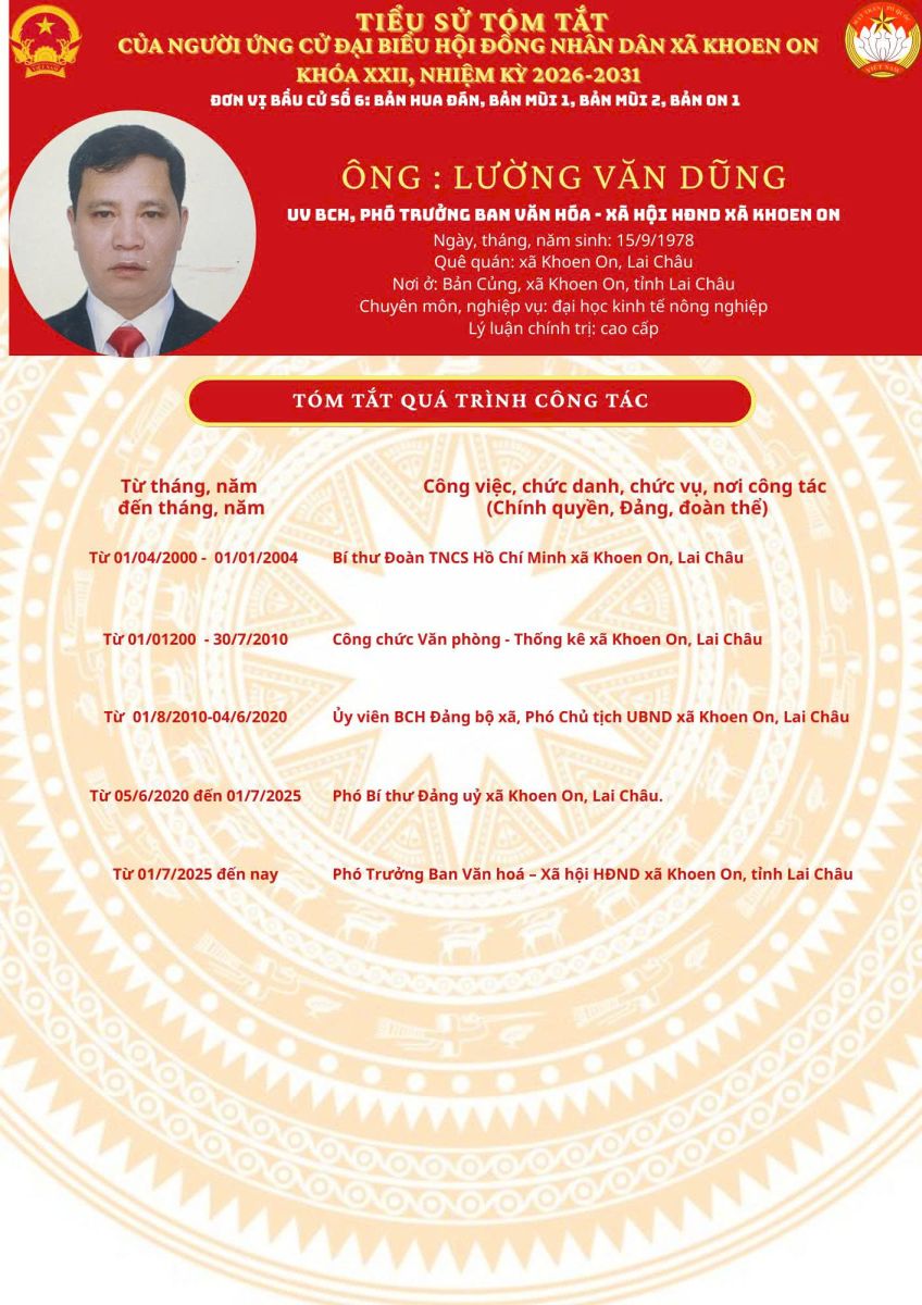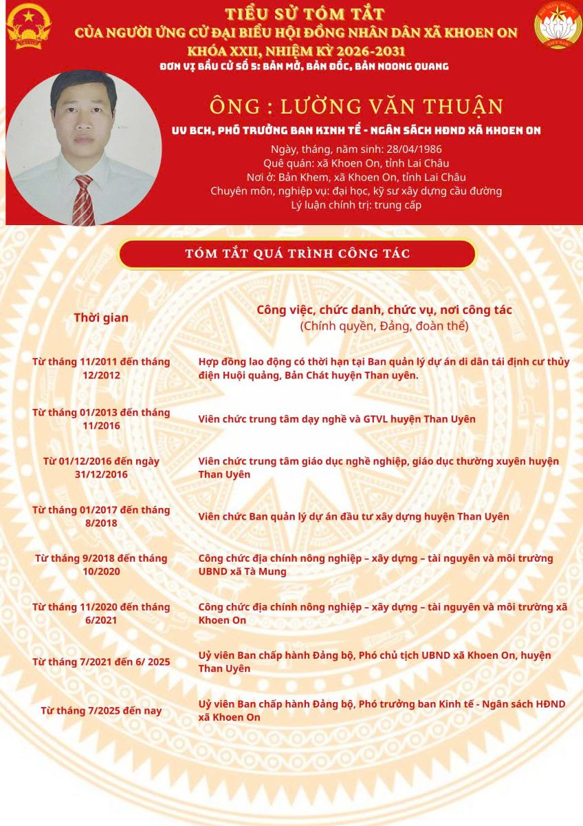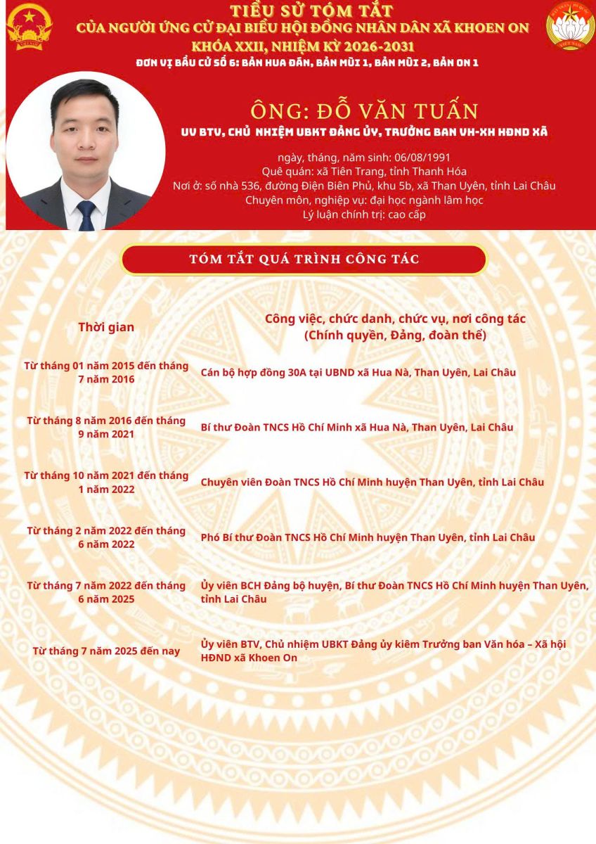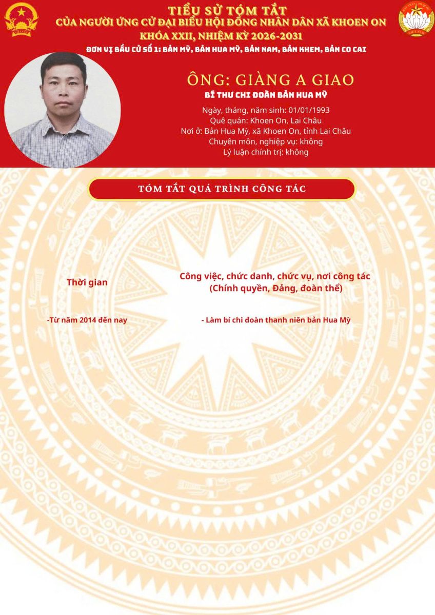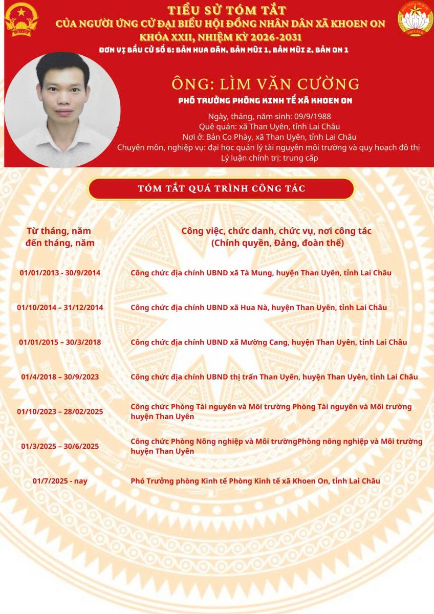 TIỂU SỬ TÓM TẮT NGƯỜI ỨNG CỬ ĐẠI BIỂU HĐND XÃ KHOEN ON KHÓA XXII, NHIỆM KỲ 2026–2031 THEO TỪNG ĐƠN VỊ BẦU CỬ