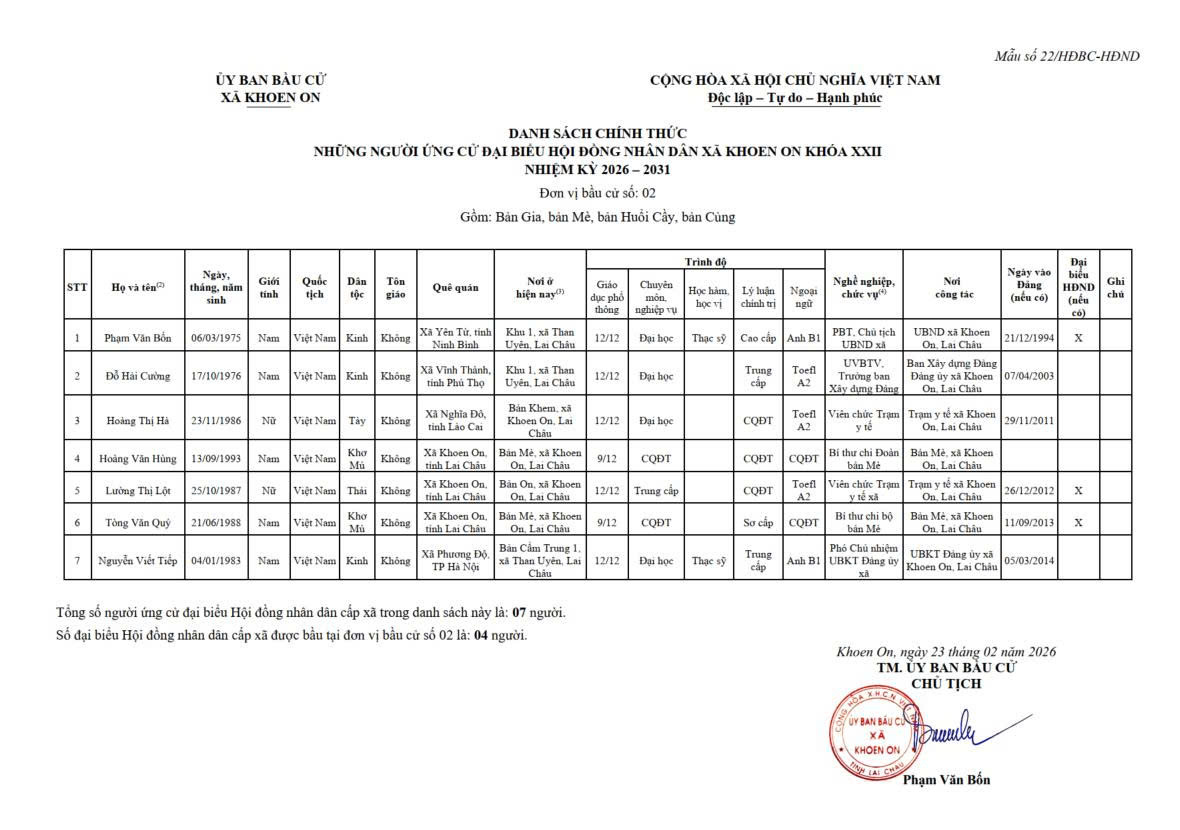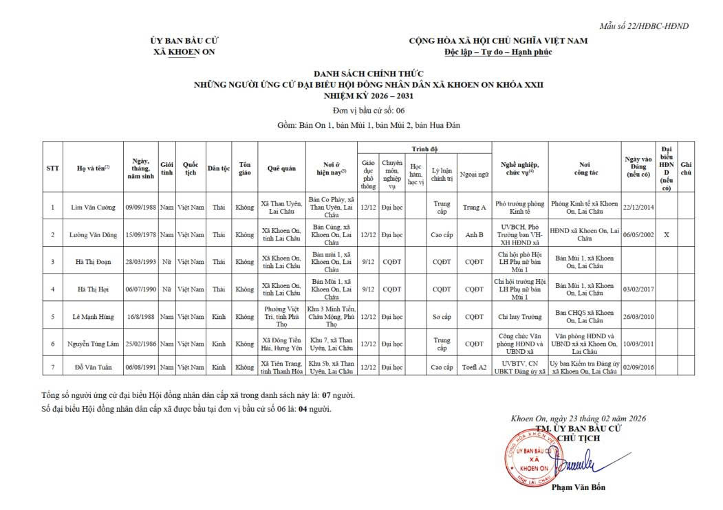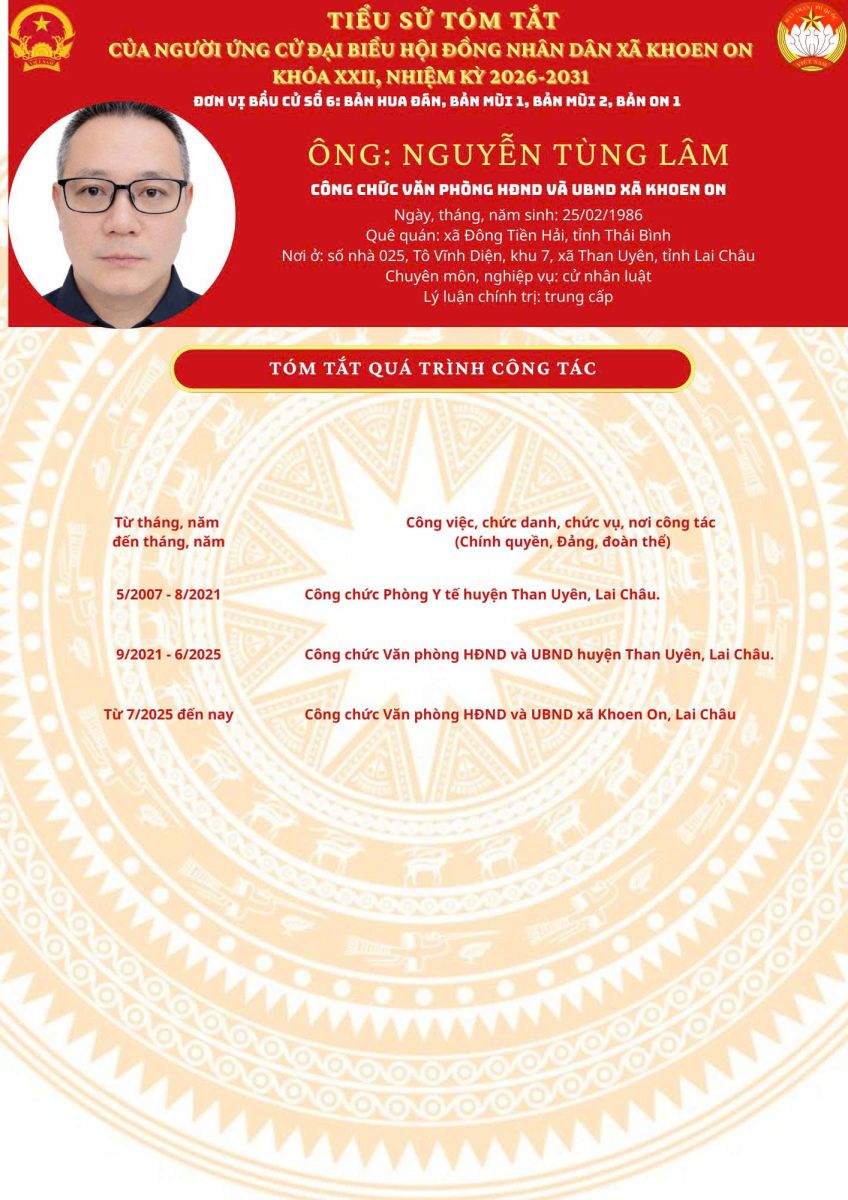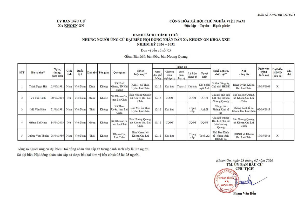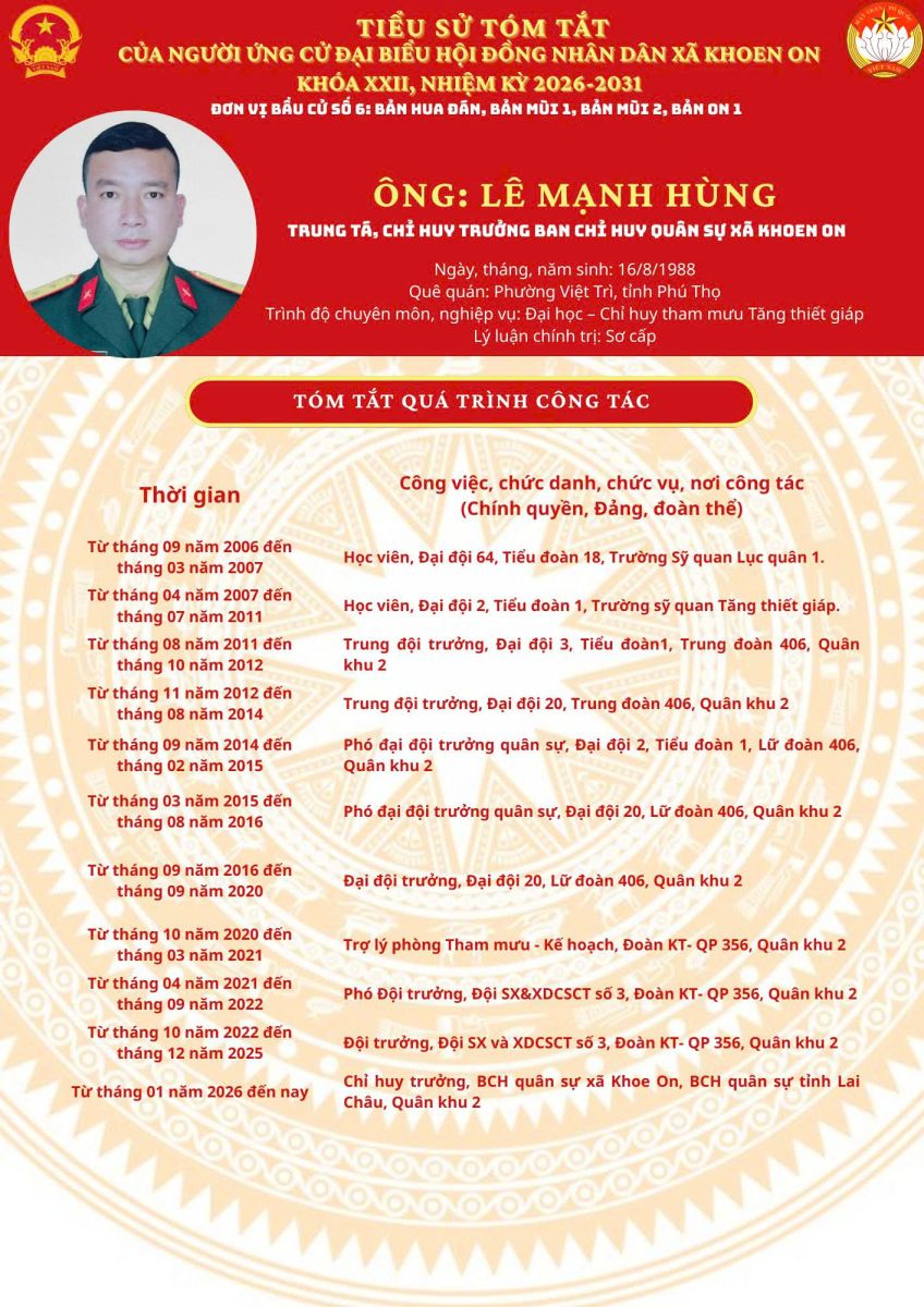 TIỂU SỬ TÓM TẮT NGƯỜI ỨNG CỬ ĐẠI BIỂU HĐND XÃ KHOEN ON KHÓA XXII, NHIỆM KỲ 2026–2031 THEO TỪNG ĐƠN VỊ BẦU CỬ