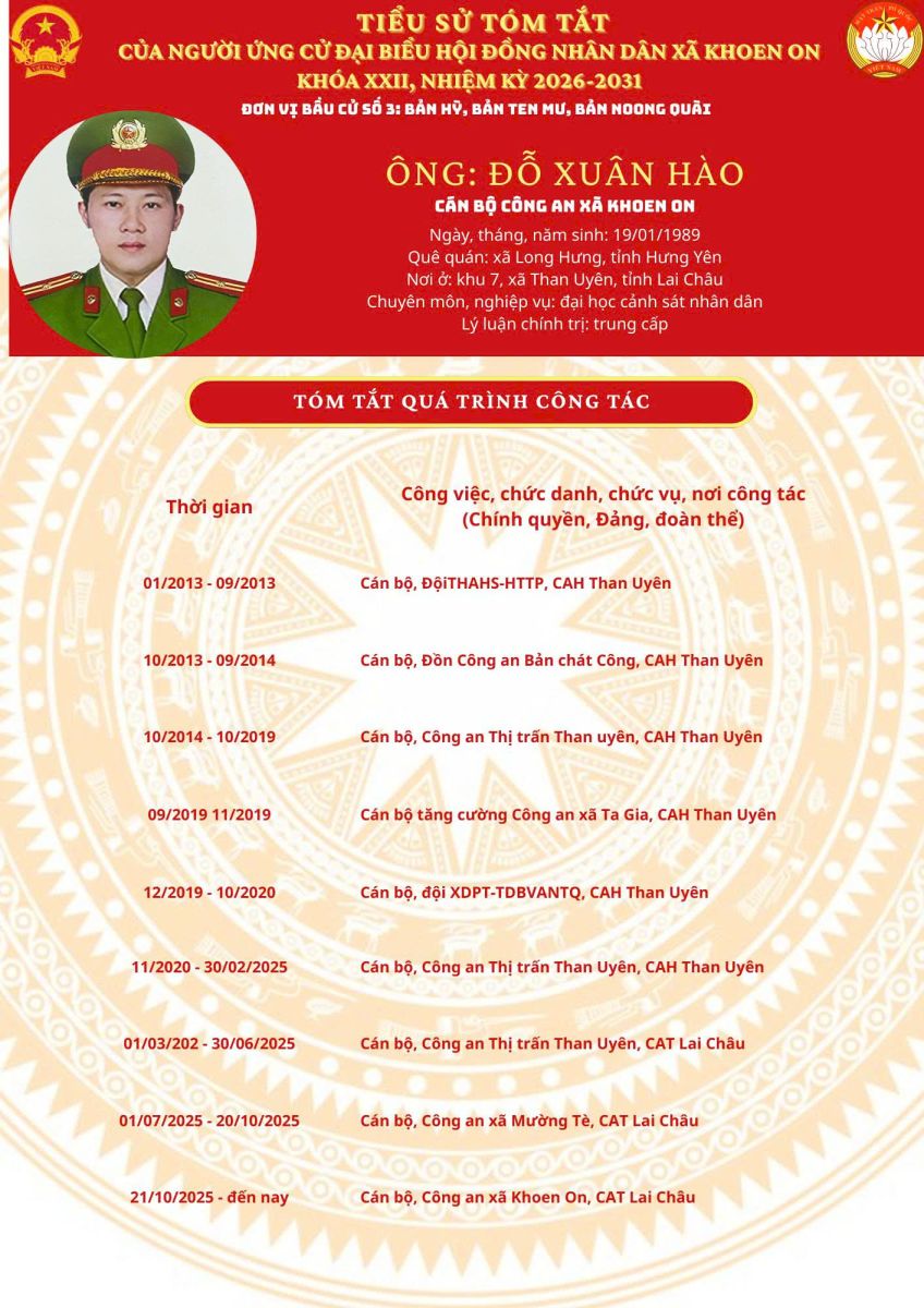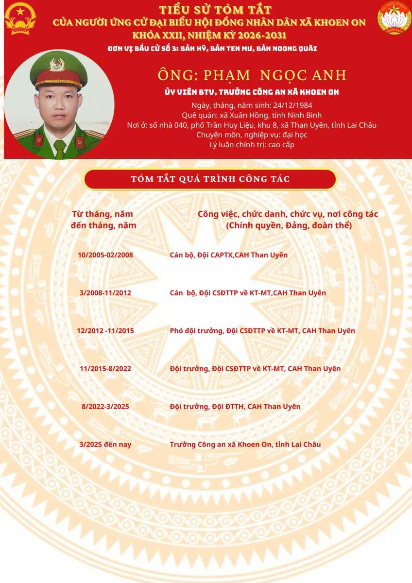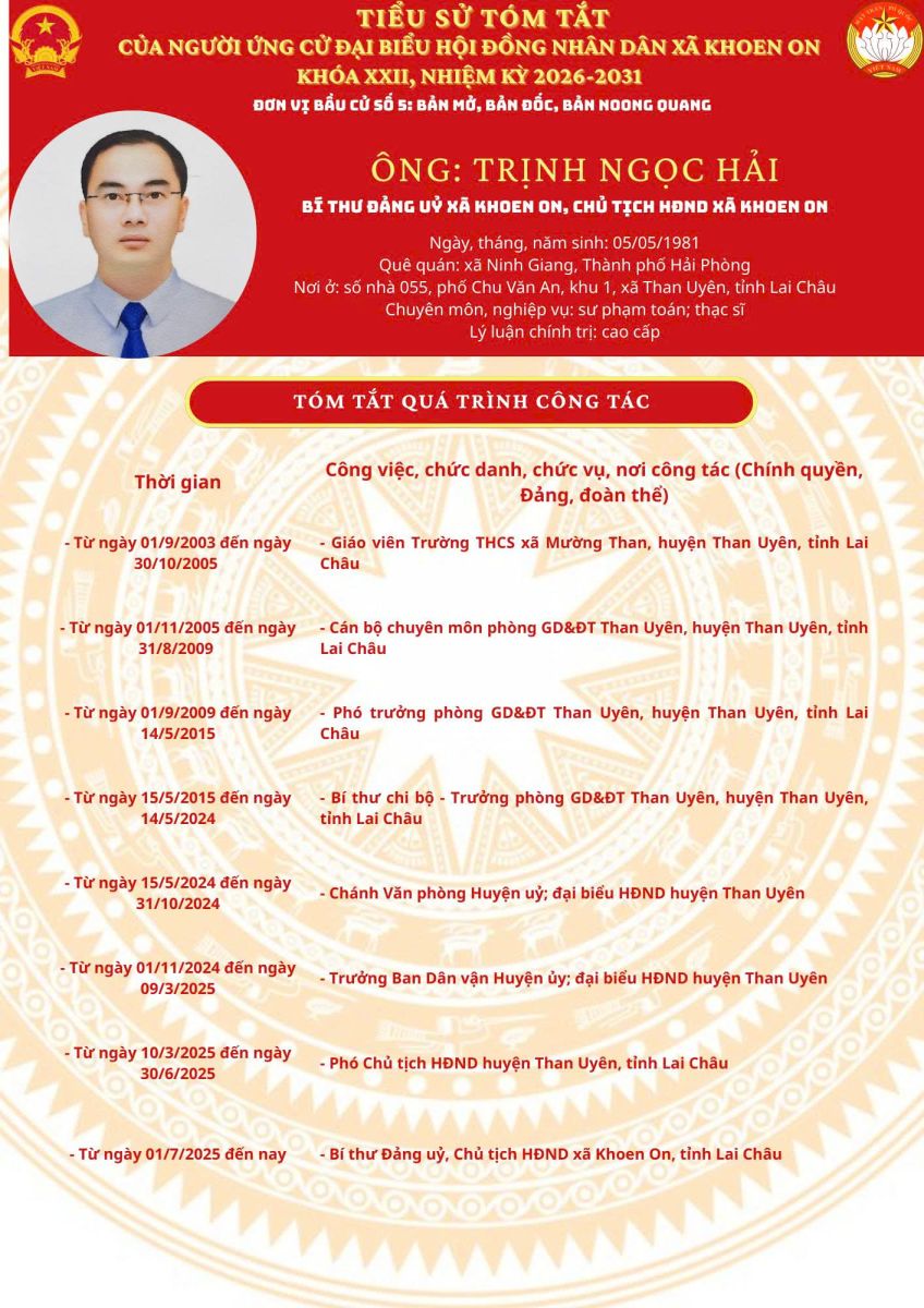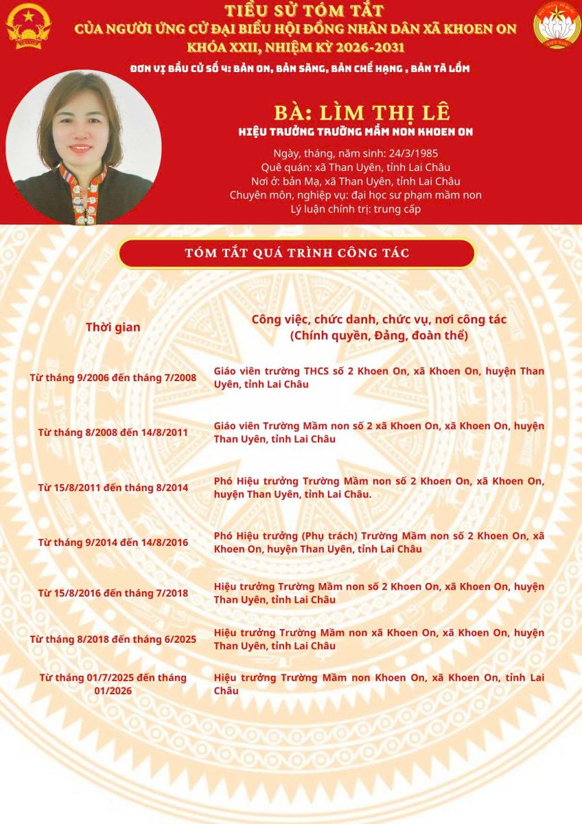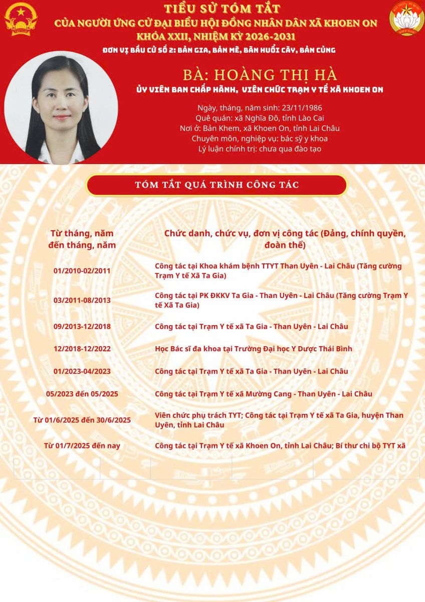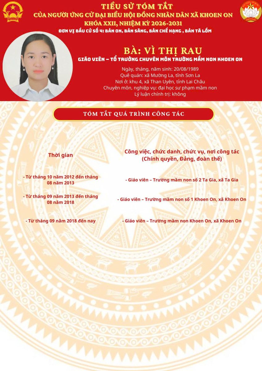 TIỂU SỬ TÓM TẮT NGƯỜI ỨNG CỬ ĐẠI BIỂU HĐND XÃ KHOEN ON KHÓA XXII, NHIỆM KỲ 2026–2031 THEO TỪNG ĐƠN VỊ BẦU CỬ