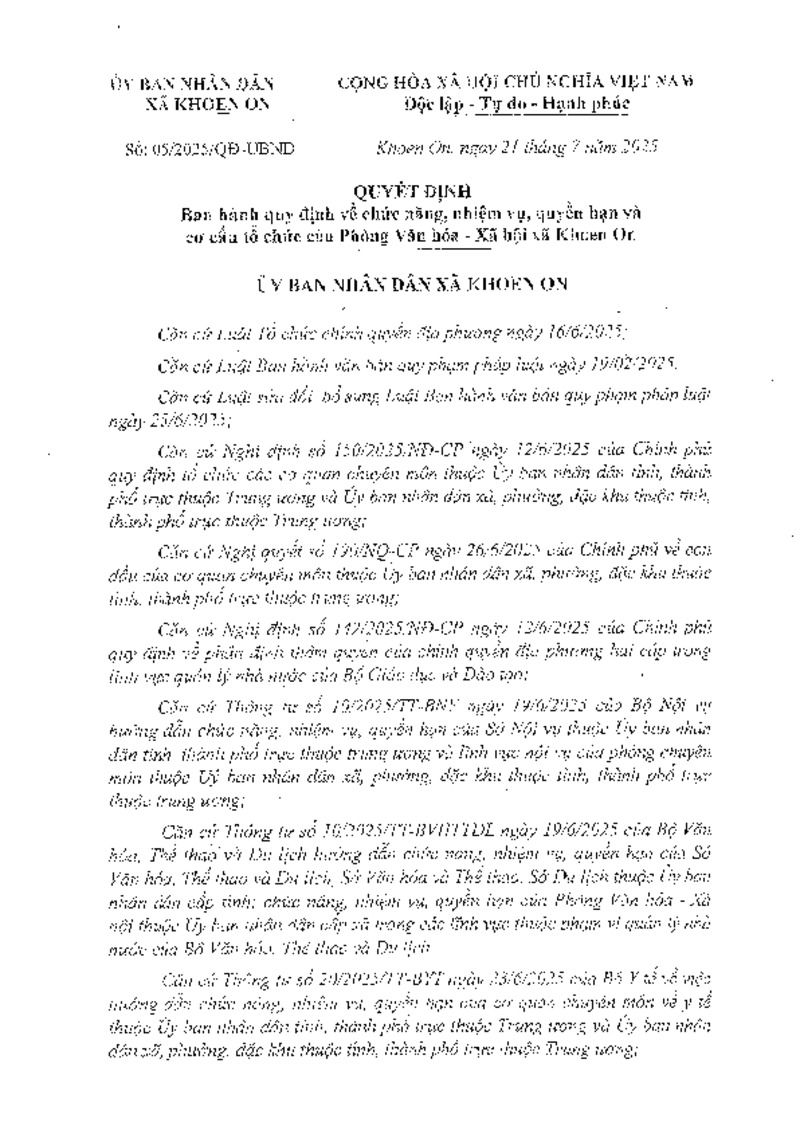 | Tiêu đề văn bản | Quyết định ban hành quy định vị trí, chắc năng, nhiệm vụ, quyền hạn và cơ cấu tổ chức của Phòng Văn hóa - Xã hội xã Khoen On | ||