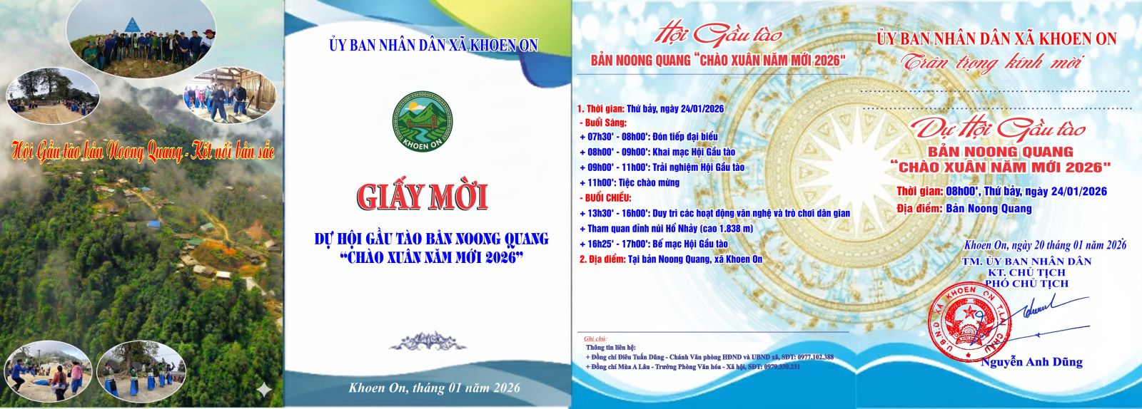 Thứ tư, 21/01/2026 | 09:29 A- A A+ | TRÂN TRỌNG KÍNH MỜI DỰ HỘI GẦU TÀO BẢN NOONG QUANG "CHÀO XUÂN NĂM MỚI 2026" Chia sẻ Lưu Noong Quang. Tác giả: Lìm Dơn Nguồn:Ban triển khai hoạt động Dự án CWS xã Khoen On Copy link Tổng số điểm của bài viết là: 0 trong 0 đánh giá Click để đánh giá bài viết Tin liên quan Kỳ họp thứ nhất HĐND xã Khoen On khóa XXII, nhiệm kỳ 2026 - 2031 🏃♂️ Sôi nổi Ngày chạy Olympic vì sức khỏe toàn dân năm 2026 tại xã Khoen On Đại hội đại biểu hội LHTN Việt Nam xã Khoen On lần thứ nhất, nhiệm kỳ 2026 - 2029 Khai mạc Hội thi giáo viên dạy giỏi cấp xã năm học 2025-2026 Xã Khoen On tổ chức Ngày chạy Olympic và chợ Thẳm Củng tháng 3 năm 2026 Thông báo tuyển sinh vào các Trường CAND năm 2026 Truyền thông nâng cao nhận thức cộng đồng về phòng cháy chữa cháy rừng Xã Khoen On tổ chức thành công cuộc bầu cử Đại biểu Quốc hội khoá XVI và đại biểu HĐND các cấp, nhiệm kỳ 2026 - 2031 Gặp mặt, động viên công dân lên đường nhập ngũ Chương trình TXCT của các đại biểu ứng cử Đại biểu HĐND xã Khoen On khoá XXII, nhiệm kỳ 2026 - 2031 Không khí phấn khởi ngày đầu học sinh trở lại trường sau Tết trên địa bàn xã Khoen On Lễ ra quân huấn luyện năm 2026