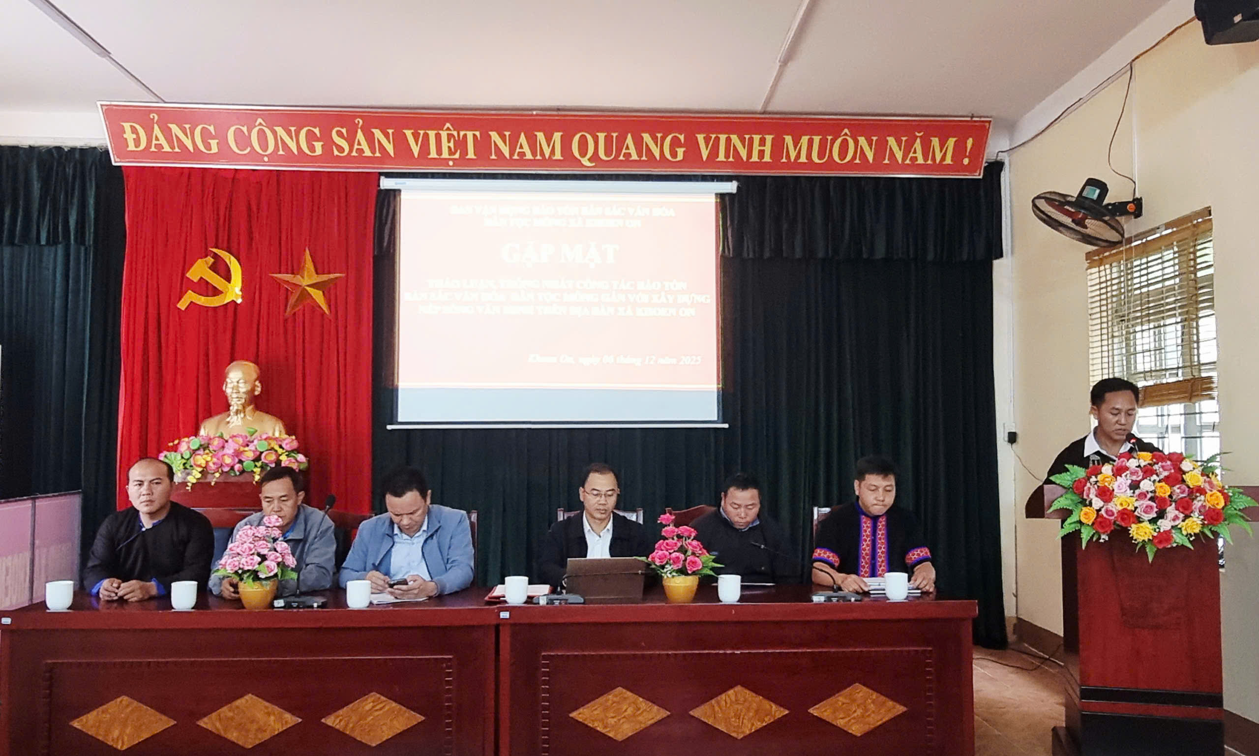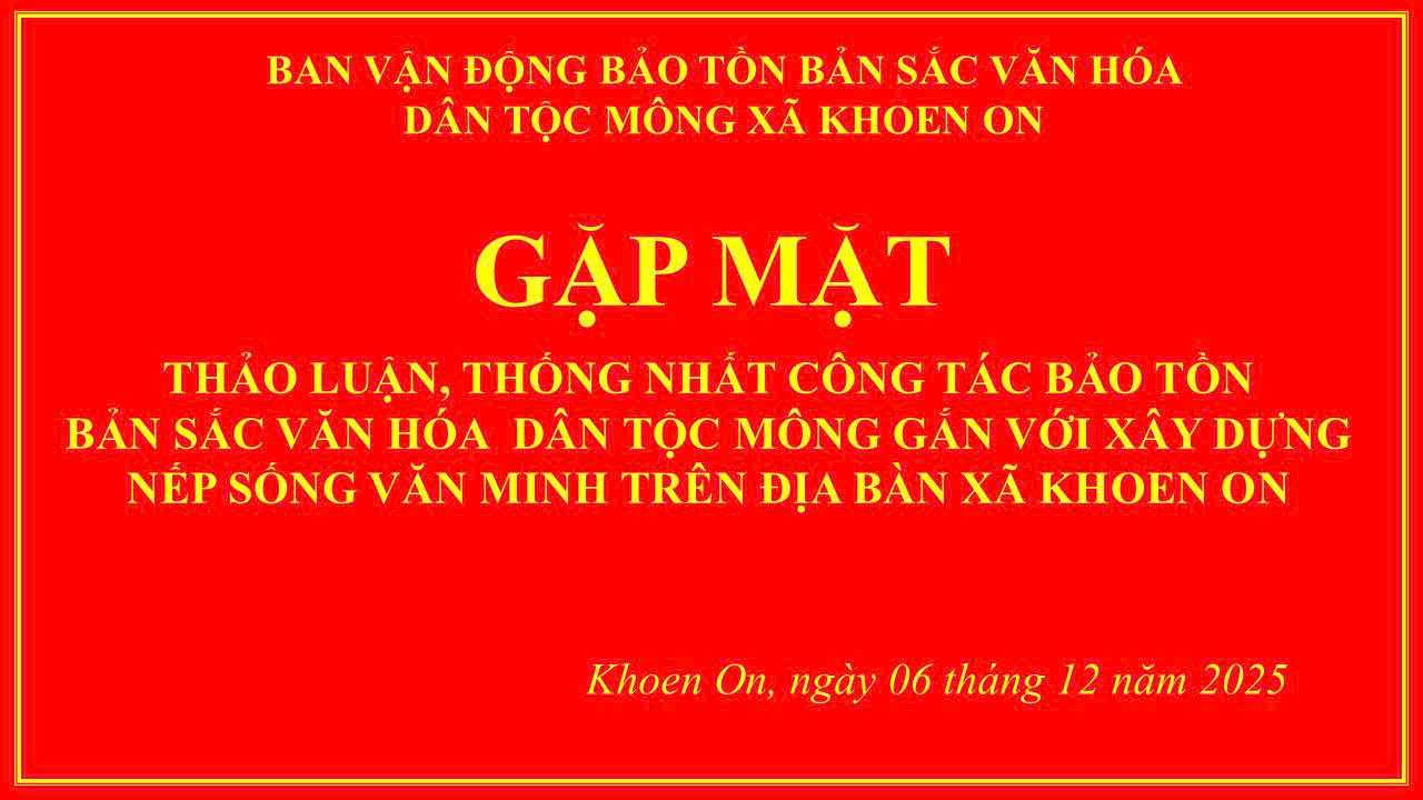Sáng ngày 06/12/2025, tại Hội trường HĐND-UBND xã Khoen On (bản Củng), Ban Vận động Bảo tồn bản sắc văn hóa dân tộc Mông tổ chức gặp mặt thảo luận, thống nhất công tác bảo tồn bản sắc văn hóa dân tộc Mông gắn với xây dựng nếp sống văn minh trên địa bàn xã. Buổi gặp mặt có sự tham dự của đồng chí Trịnh Ngọc Hải - Bí thư Đảng ủy, Chủ tịch HĐND xã, đồng chí Lò Việt Hưng - Phó Bí thư Thường trực Đảng ủy, đồng chí Phạm Văn Bốn - Phó Bí thư, Chủ tịch UBND xã, lãnh đạo Đảng ủy, HĐND, UBND xã, đại diện lãnh đạo các cơ quan đảng, MTTQ, đại diện các đoàn thể và các thành viên Ban Vận động.
