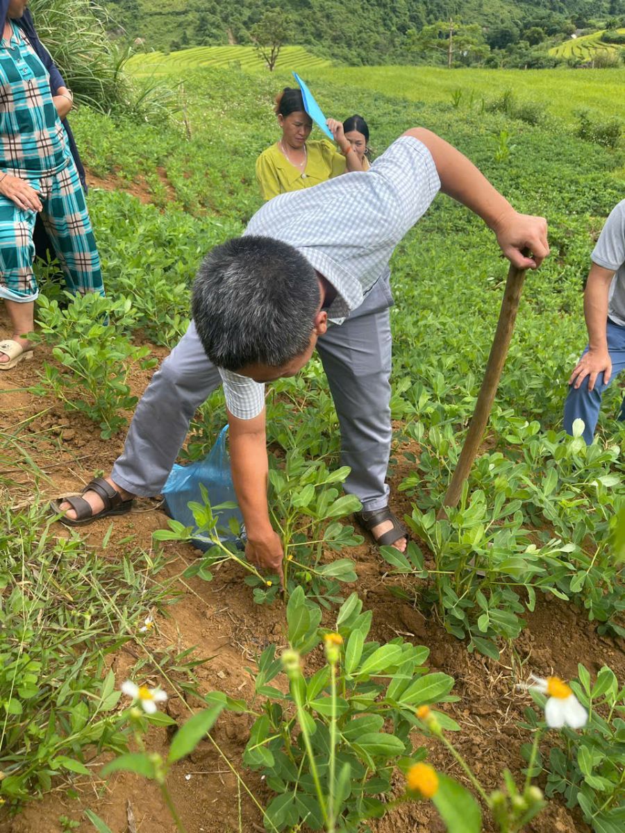 Trong buổi sáng, học viên được giảng viên hướng dẫn về kỹ thuật chuẩn bị giống, làm đất, thời vụ trồng, bón phân, nhận diện và phòng trừ sâu bệnh hại. Buổi chiều, các hộ dân trực tiếp thực hành trên nương lạc của hộ mẫu với các thao tác: lên luống, gieo hạt, vun gốc, bón thúc và quan sát sâu bệnh ngoài đồng ruộng.