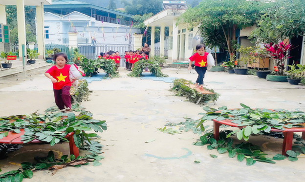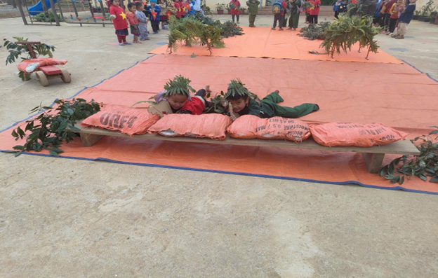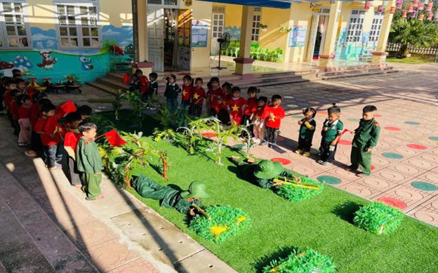 Bên cạnh đó, nhà trường còn tổ chức nhiều hoạt động trải nghiệm phong phú như: Vẽ tranh chú bộ đội, hát múa các bài hát về quê hương - đất nước, chơi trò chơi vận động “Bé làm cô chú bộ đội”, xếp hàng…