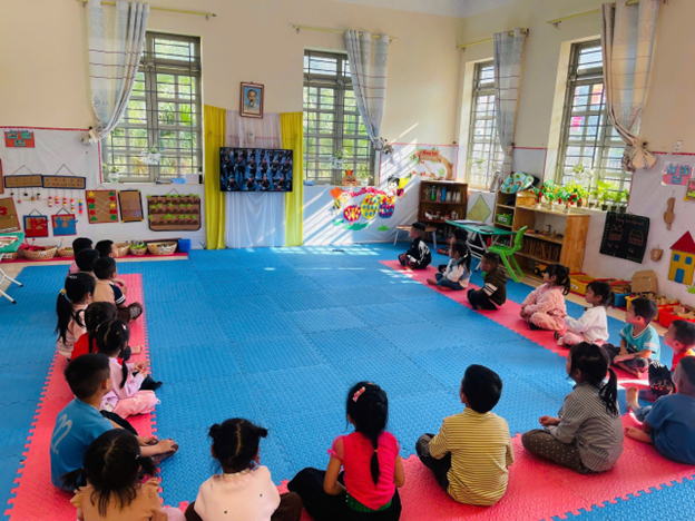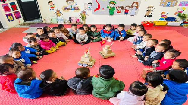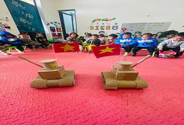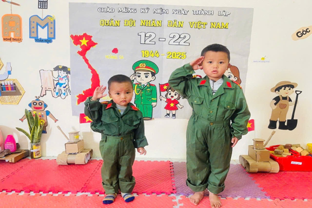 Thông qua các giờ học lồng ghép chủ đề 22/12, trẻ được làm quen với hình ảnh cô chú bộ đội, trang phục màu xanh quen thuộc, công việc hằng ngày của các cô chú trong việc bảo vệ Tổ quốc. Bằng hình thức kể chuyện, xem tranh ảnh, video minh họa sinh động, các cô đã giúp trẻ tiếp cận kiến thức một cách nhẹ nhàng, gần gũi, tạo sự hứng thú và tò mò khám phá.